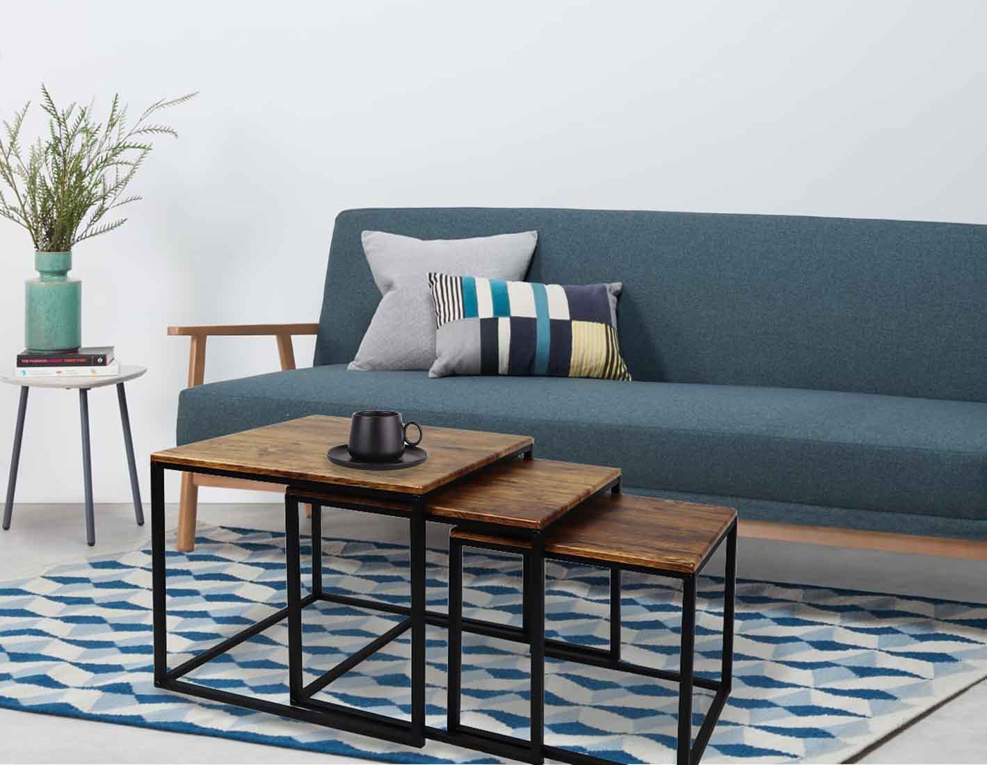 - Apportez fonctionnalité et style à votre salon avec l'ensemble de 3 tables gigognes Alana. Leur format compact en fait un meuble pratique qui n'encombre pas l'espace. Elles arborent une finition vintage et une structure métallique robuste à revêtement en poudre, créant ainsi un élégant mélange de matériaux qui sublimera votre pièce.