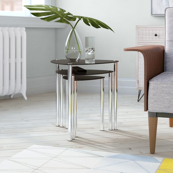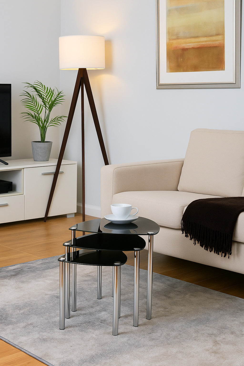 - Ensemble de 3 tables gigognes triangulaires en verre Arena - Verre noir, tubes en acier finition chromée.
