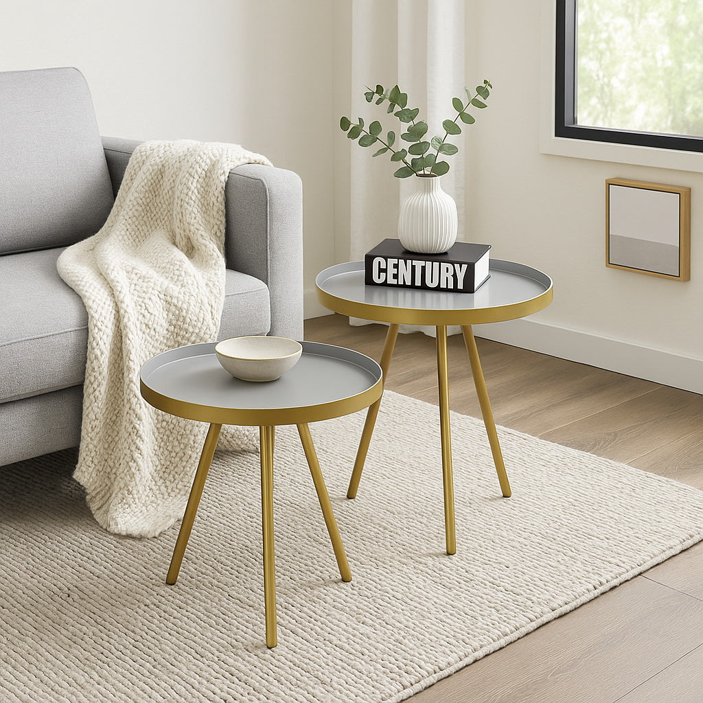 - L'ensemble de deux tables d'appoint Ava est l'élément décoratif idéal pour tout espace de vie, apportant une touche d'inspiration mid-century à votre intérieur. Lors de vos réceptions, vos invités seront conquis par la finition élégante dorée et grise et le design unique de leur piètement tripode. Le plateau original et pratique permet de ranger vos petits objets, et le montage sans outil fait de ces tables d'appoint un complément parfait à tout décor. Avec les tables d'appoint Ava, votre intérieur gagnera en sophistication et en caractère.