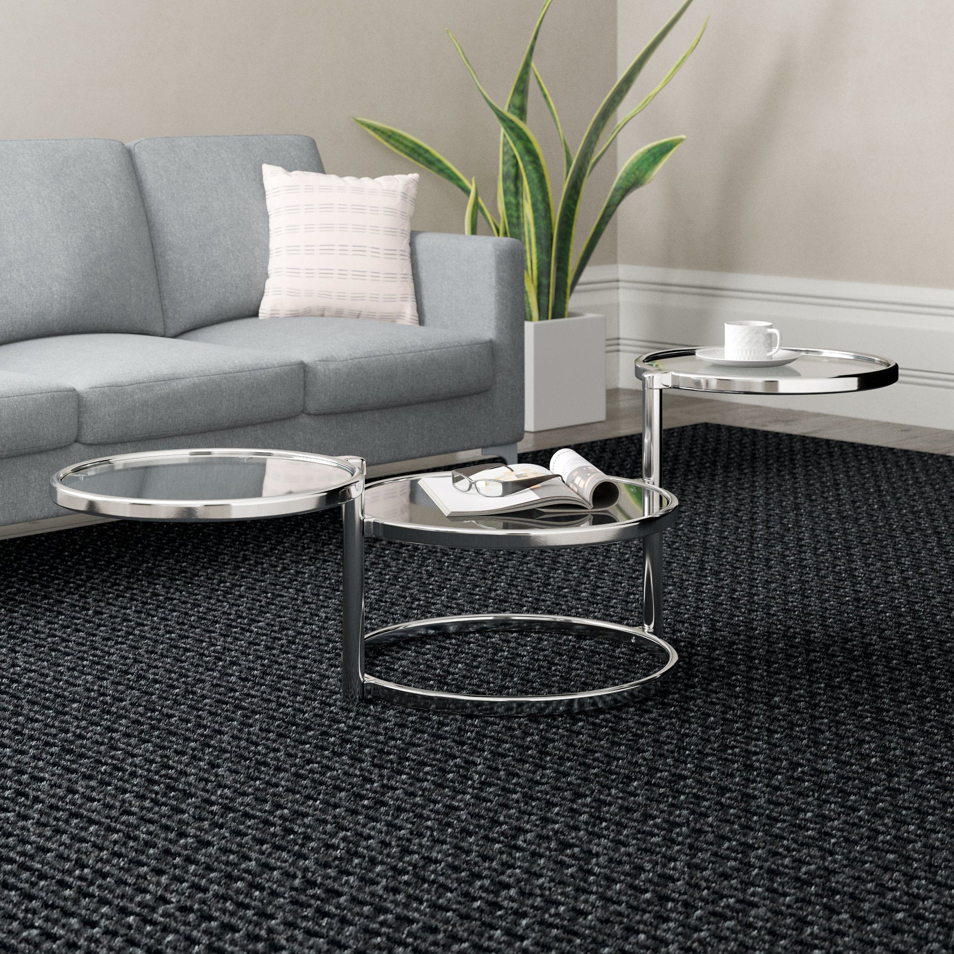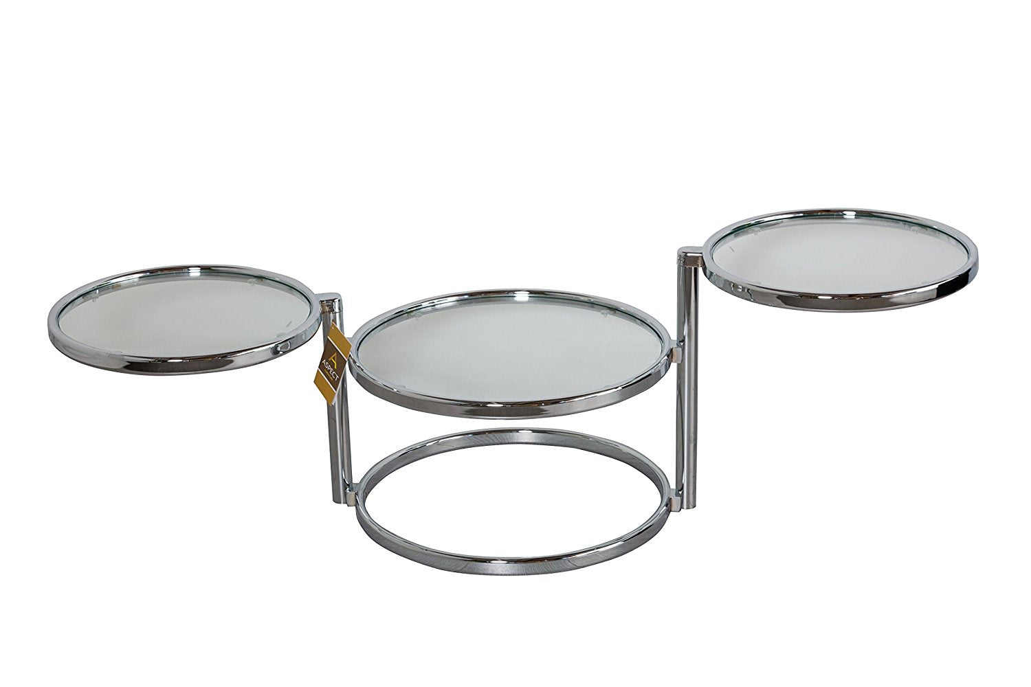- Inspirée des tables basses pivotantes du milieu du siècle dernier, cette table moderne se compose de trois plateaux en verre. Les plateaux supérieur et inférieur pivotent pour offrir plus d'espace et se replient lorsqu'ils ne sont pas utilisés.