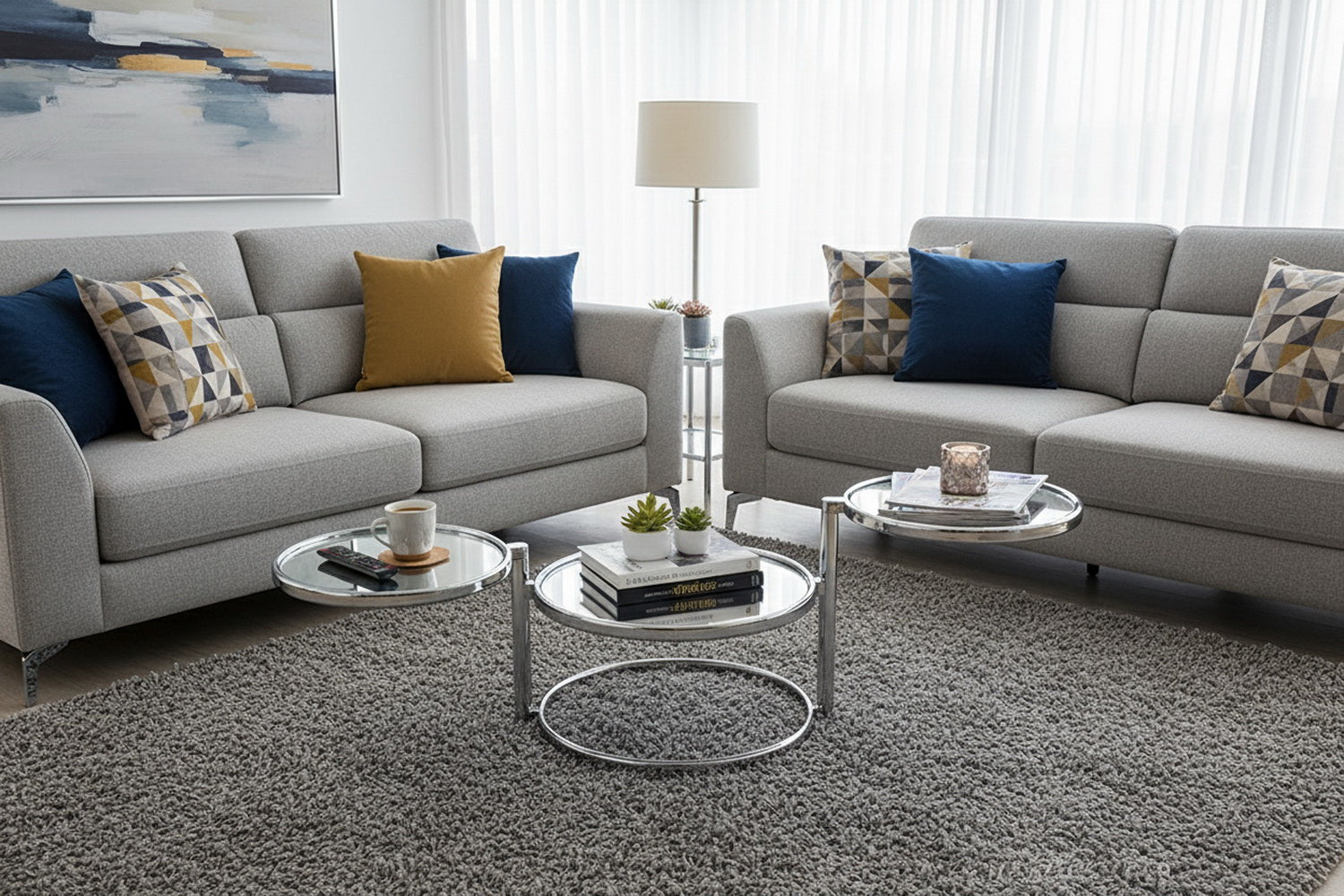 - Une table basse en verre de forme unique avec des étagères rondes mobiles