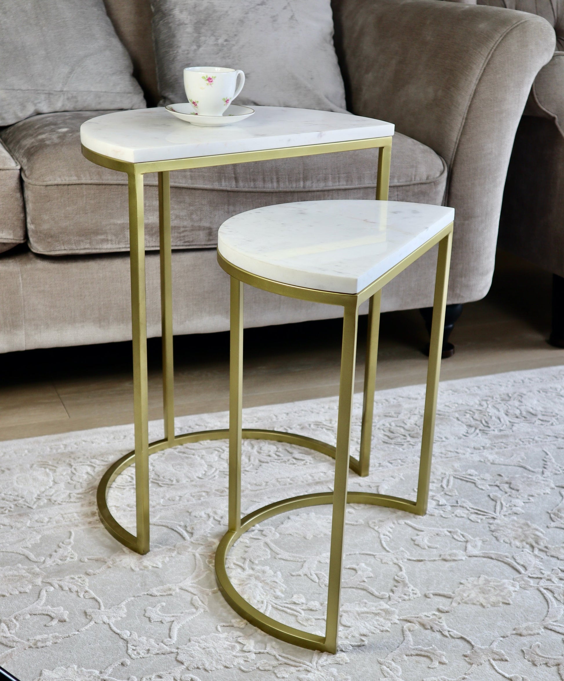 - Élégantes et contemporaines, ces tables gigognes Luxore sont dotées de plateaux en marbre blanc véritable aux magnifiques veines, associés à de fins cadres en métal doré, le tout formant une demi-lune. À NOTER : LES VARIATIONS NATURELLES DE COULEUR ET DE VEINAGE DU MARBRE RENDENT CHAQUE PIÈCE UNIQUE.
