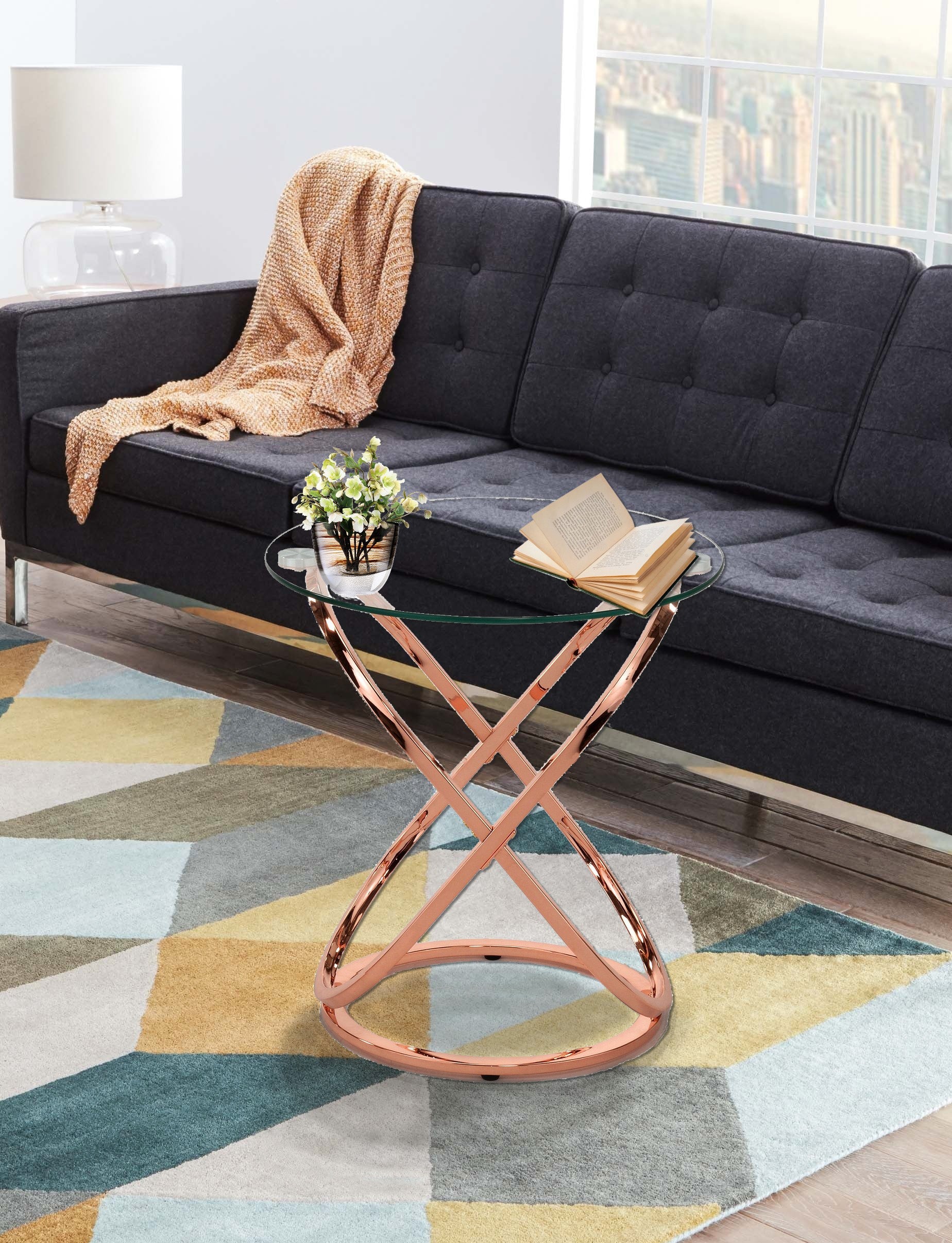 - Le plateau en verre transparent confère à votre pièce une impression de fluidité et d'espace, tandis que le pied chromé ou cuivré y apporte une touche d'éclat. La table basse/d'appoint Monarch est idéale pour tout intérieur moderne. Elle se présente comme une sculpture suspendue dans l'espace, avec un plateau en verre trempé transparent. Cette surface spacieuse offre un espace généreux pour vos téléphones, vases, assiettes, tasses, livres et autres accessoires.